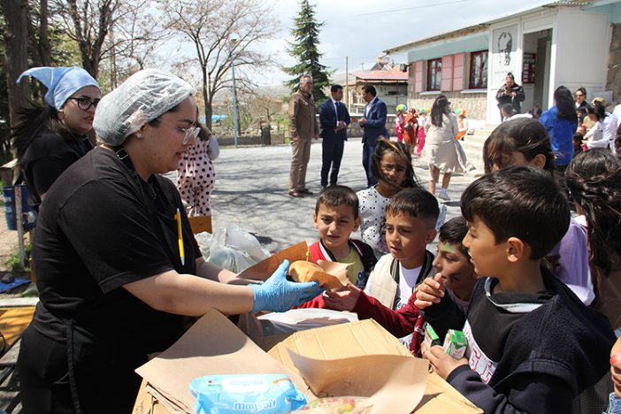 Okul bahçesinde hamburger yapılan ve ebru sanatı etkinliği düzenlenen programda, ilkokul öğrencileri kendileri için hazırlanan temsili doğum günü pastasını kesti.