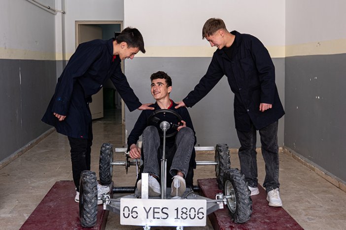 Öğretmenlerinden ilgili dersleri almalarının ardından hayalini kurdukları "gokart" aracını yapmak için kollarını sıvayan öğrenciler, okulda metal teknolojileri alanındaki arkadaşlarından da tasarım için destek alarak aracın şasisini oluşturdu.