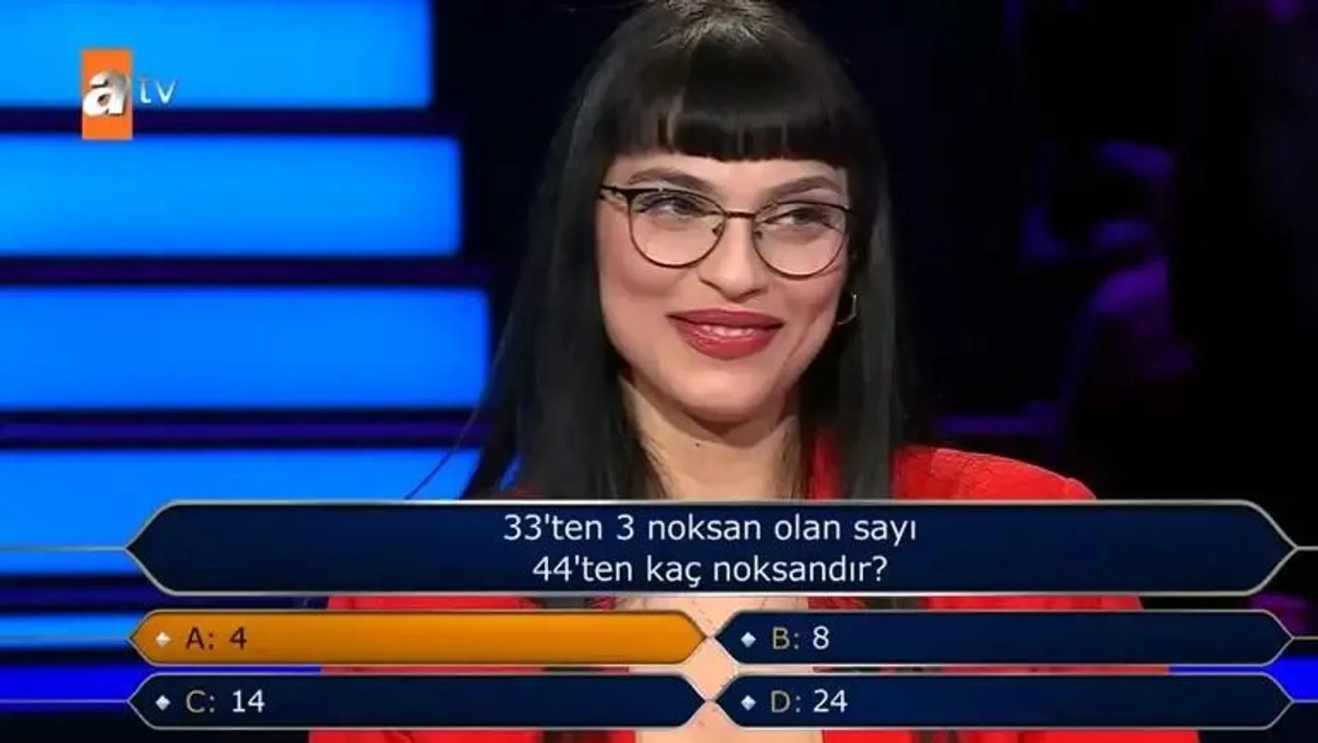 Yarışmacı “33’ten 3 noksan olan sayı, 44’ten kaç noksandır?” sorusuna doğru yanıt veremedi. 5 bin lira kazanarak yarışmadan ayrılan Korkmaz’ın takıldığı soru sosyal medyada geniş yankı uyandırdı.